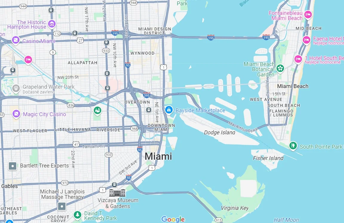 Metropola americkej Floridy, Miami, je oslnivý tropický raj s množstvom paliem, kde vďaka teplému Golfskému prúdu vždy vládne príjemne teplé počasie. Miami leží v zálive Biscayne Bay na ostrove Dodge Island, ktorý je spojením 3 ostrovov (Dodge, Lummus a Sam's). Je prepojený s ostrovom Watson tunelom Port of Miami Tunnel.